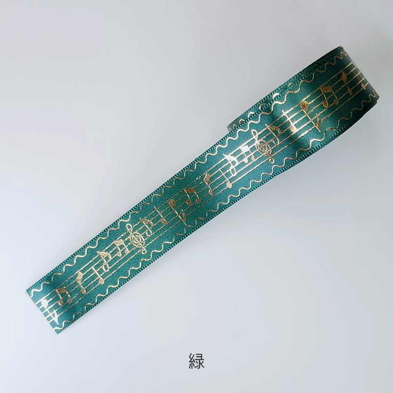 約2.5cm幅のサテン素材にゴールド基調の箔押しプリントがされたリボンです。